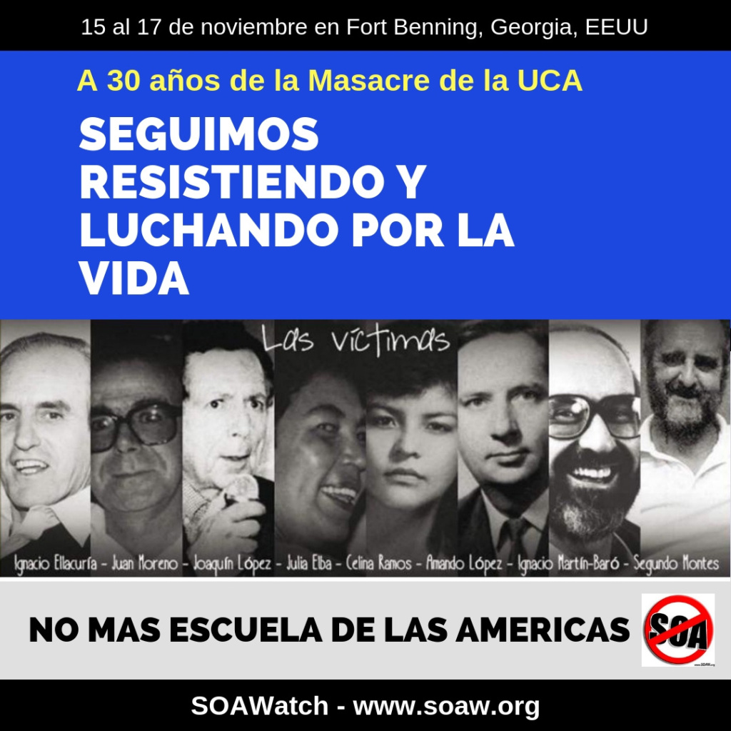 Entre los días 15 al 17 de noviembre, en el marco de los 30 años de la masacre de la UCA (Universidad Centroamericana), el movimiento de la SOA Watch realizará, acciones y actividades en Fort Benning, Georgia, Estados Unidos, para recordar, honrar, y decir Presente a los que ayer y hoy siguen siendo asesinados por toda América Latina. Seguir leyendo…