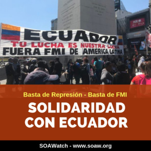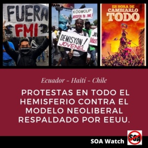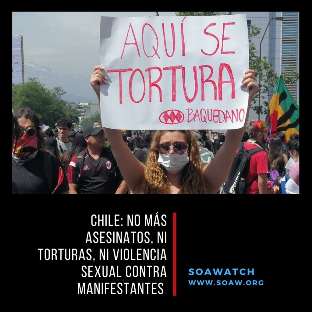 Este 10 de diciembre es el Día Internacional de los Derechos Humanos y SOA Watch quiere reiterar su condena profunda por las sistemáticas y graves violaciones a los derechos humanos — asesinatos, violencia sexual, tortura, y lesiones graves — que está viviendo el pueblo chileno en el marco de la represión brutal que militares y policías han efectuado contra la población que protesta. Las manifestaciones, que comenzaron en octubre pasado y que se mantienen hasta el día de hoy, exigen al Estado, al gobierno, encabezado por Sebastián Piñera, poner fin a los abusos que imponen las políticas neoliberales contra la población. Al mismo tiempo, demandan una nueva Constitución para Chile. Seguir leyendo…